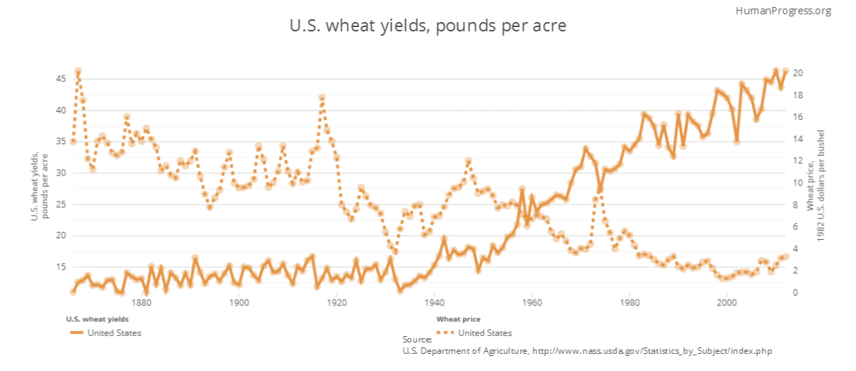 The United States has long been known as the world's breadbasket, and recent advances in agriculture has only helped make American agriculture more efficient. The technological advances with GMO's and and year-round crop growth have not only raised wheat yields, but also dramatically reduced the price.