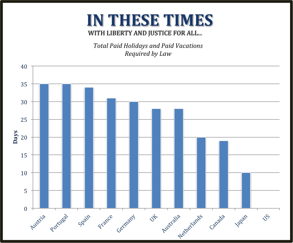 The United States is the only country among the top 21 economies that lacks a law requiring employers to provide any days of paid vacation or paid holiday. Nearly a quarter of US workers are granted no paid leave, and nearly 40% haven't taken a vacation in the past two years.