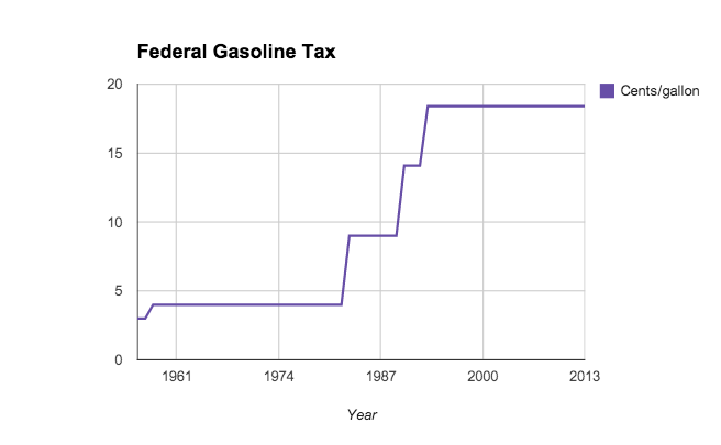 In 1956 the Highway Trust Fund was established with revenue generated from a dedicated fuel tax of 3 cents/gallon. Presidents Reagan and Bush Sr. each raised the tax by 5 cents per gallon. In 1993 President Clinton raised it by a little over 4 cents. And there, at 18.4 cents per gallon, it has remained for the last 21 years.