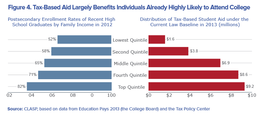 Low-income students still attend college at lower rates than high-income students. The lowest-income students are only one-seventh as likely as highest-income peers to attain a bachelor’s degree by 24. Poor targeting blunts the impact of tax-based aid on socioeconomic mobility and it's an inefficient way to promote college affordability and access because higher-income individuals are already likely to attend college